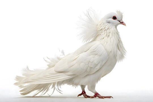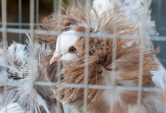 A Jacobin pigeon, a domesticated breed of pigeon originating in Asia inside a cage at an agriculture exhibit.