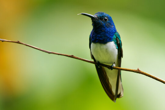 Beautiful White-necked Jacobin hummingbird, Florisuga mellivora, hovering in the air with green and yellow background. Best humminbird of Costa Rica