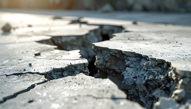 A deep jagged crack splits a textured concrete surface dramatically lit by harsh sunlight creating contrast and shadow