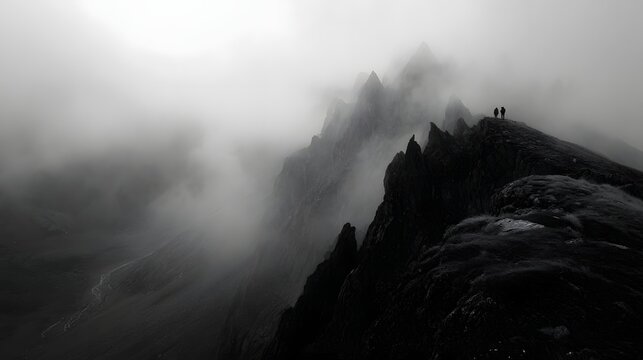 Silhouetted figures stand on a dramatic misty alpine ridge with jagged peaks overlooking a deep valley