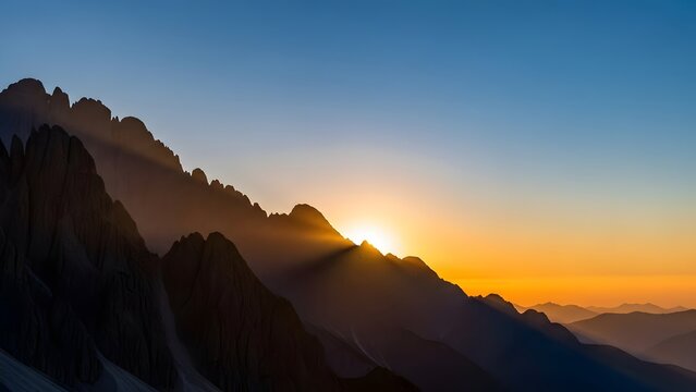 Stunning sunrise crests jagged mountain peaks casting dramatic light rays across a vast, serene alpine landscape