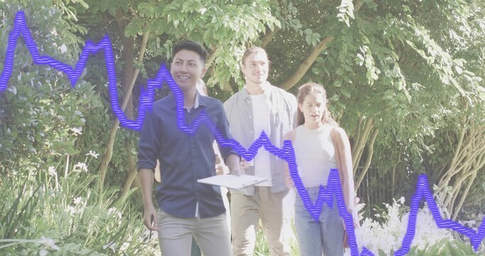 Walking trio in casual clothing along garden path, holding clipboard and passing blue graph overlay