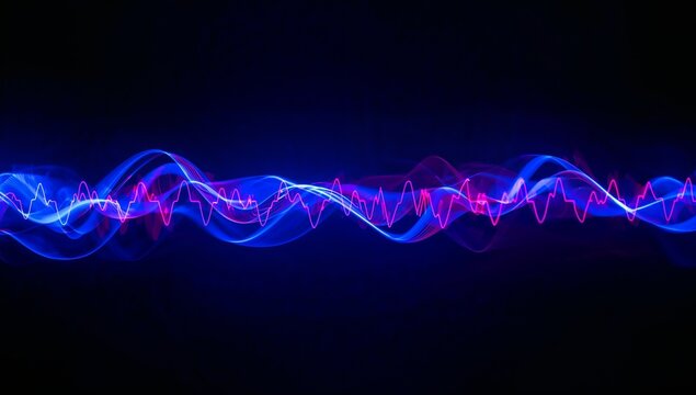 Neon waveform ribbons in blue and magenta tracing dynamic audio frequency lines