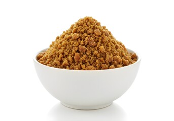 crushed jaggery in a white bowl isolated on a white background
