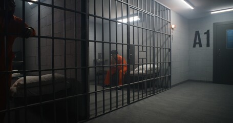 African American inmates in detention center or correctional facility. Depressed man in orange uniform sits on prison bed and looks at barred window. Prisoners serve imprisonment term in jail cell.