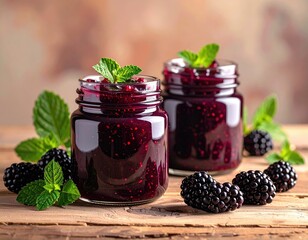 Top view of homemade beetroot jam in glass jar on rustic wooden table