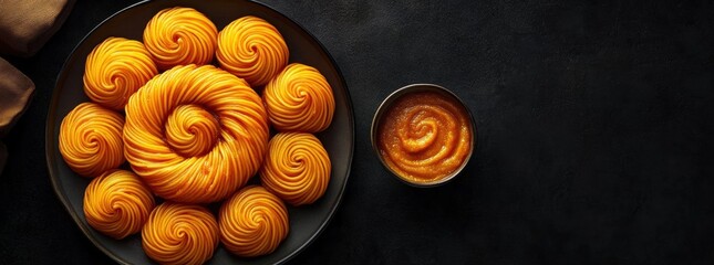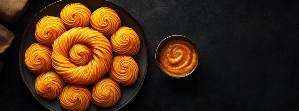 Close-up of Indian sweet Jangri (Imarti) with festive decoration for Dussehra, Navratri,