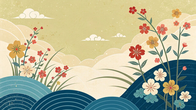 Stylized japanese landscape with blooming flowers and flowing waves in vintage style