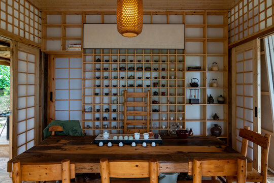 Minimal japanese tatami room featuring low chabudai table, shoji screens, tokonoma art