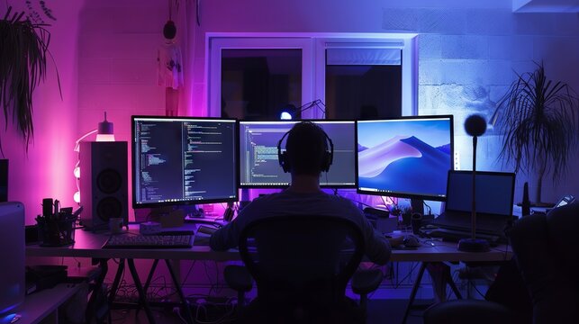 Dedicated web developer engrossed in programming on multiple monitors amidst high-tech office environment
