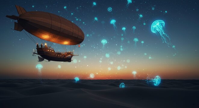 Surreal Night Scene Airship Sailing Through Starry Sky with Glowing Jellyfish
