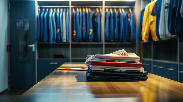 Colorful football jerseys hanging in a locker room. Concept of sports uniforms, teamwork, athlete preparation, locker room interior