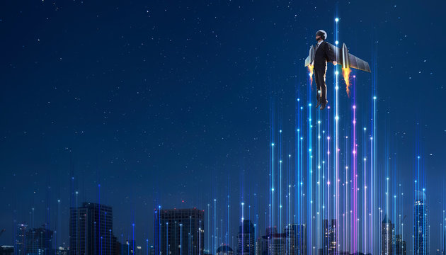 Businessman in rocket suit fly to sky with abstract dot and line lighting
