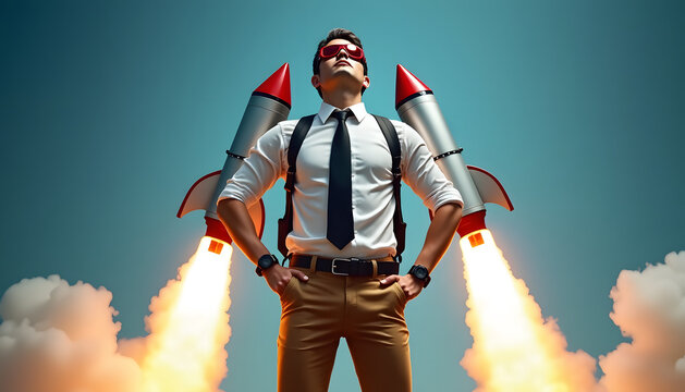 Young woman businesswoman with jetpack on the back. Business acceleration concept, startup, technology and development
