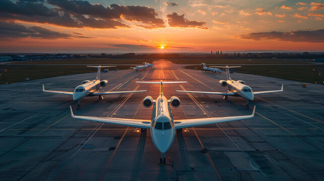A dramatic scene with several private jets lined up on a runway during a picturesque sunset.
