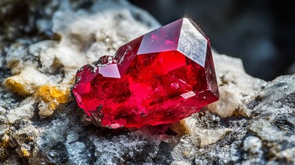 A close-up macro shot of a single ruby crystal, showcasing its vibrant red hue and intricate facets. The ruby is elegantly embedded in a natural rock surface, offering a stunning contrast.
