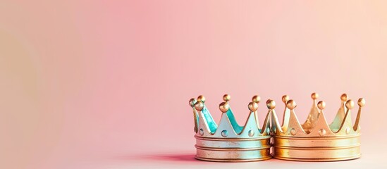 Two golden crowns isolated on a pastel background Crown. with copy space image. Place for adding text or design