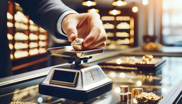 Closeup of hand putting nugget of gold on scale at jewellery shop, wealth concept