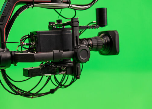 Broadcast television studio camera jib in greenscreen studio room on the ceiling.