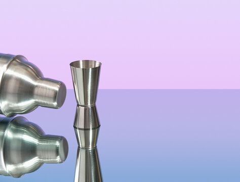 Metal jigger and shaker for making amazing alcoholic cocktails at the bar or night club. Copy space for text.