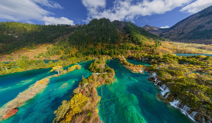 view of colorful lake and waterfall in jiuzhaigou national park, Sichuan, china