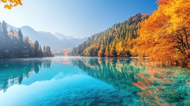 A serene lake at Jiuzhaigou National Park, with turquoise waters reflecting the vibrant autumn foliage and clear blue sky.
