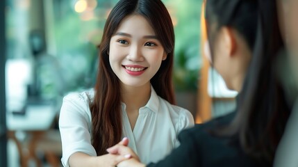 Shaking hands for a job interview of young Asian business woman in modern office. Greeting deal concept.