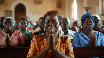African christians gathered in a church, praying with hands joined in congregation