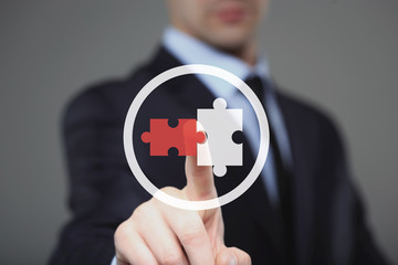 businessman hand working with computer interface show puzzles