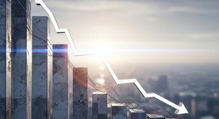 Financial downturn and economic recession illustrated with downward trending bar graph and arrow against a city skyline