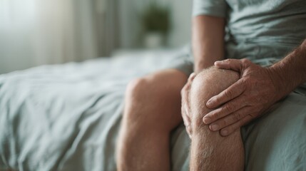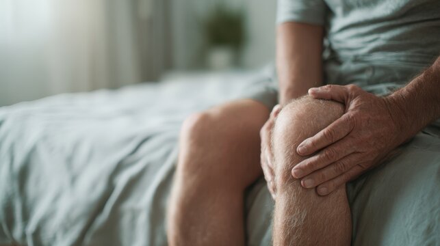 Elderly person holding knee in discomfort while sitting indoors during the afternoon