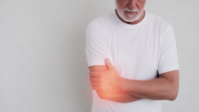 Senior man feeling arm pain, experiencing joint discomfort and inflammation, needing care medical muscle