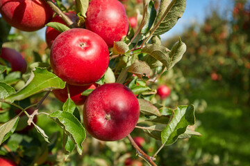 Juicy red apples hanging on the branch in the apple orchrad during autumn.
