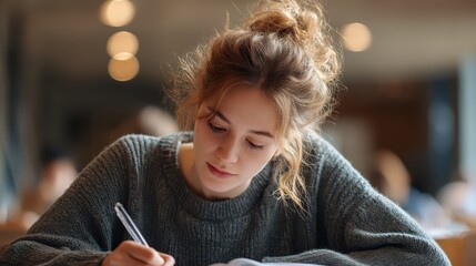 closeup shot of young woman taking down note in diary female student preparing note for the exam concentrated girl studying on a book and taking down note sitting at the desk no logos no brands ar 16