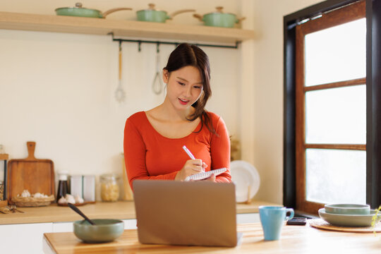 A asian eastern young woman happily jotting down notes while looking at her laptop at a kitchen counter, studying online