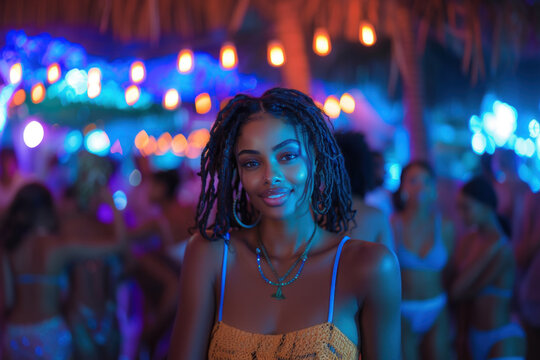 Smiling woman enjoying vibrant nightlife at beach party under lights