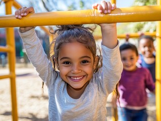 A joyful Hispanic boy hangs from the monkey bars in a playground, smiling brightly as he plays. The vibrant outdoor setting adds to the fun and excitement of his day