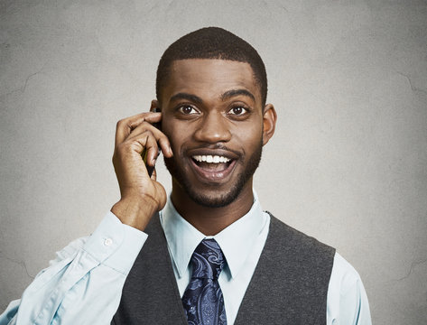 Portrait Happy man Talking on Smart Phone, grey wall background
