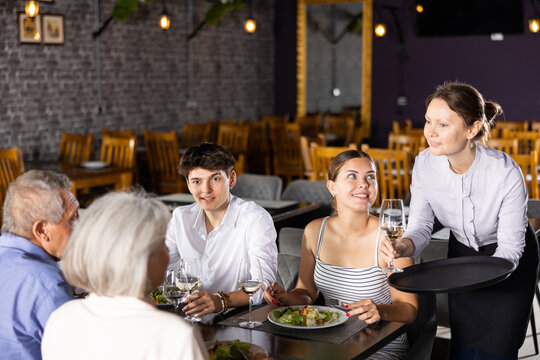 Adult woman waiter serving glass of wine to elderly couple and young couple in restaurant