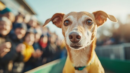 A close-up of a joyful dog in an outdoor environment, surrounded by people. The dog's lively expression adds warmth and charm, capturing joyful companionship.