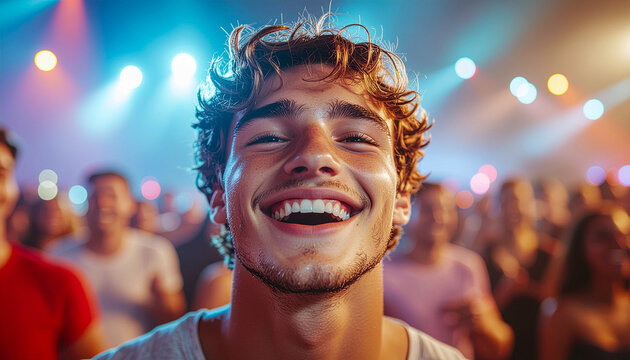Vibrant Concert Energy: Young Man's Euphoric Expression Under Colorful Stage Lights