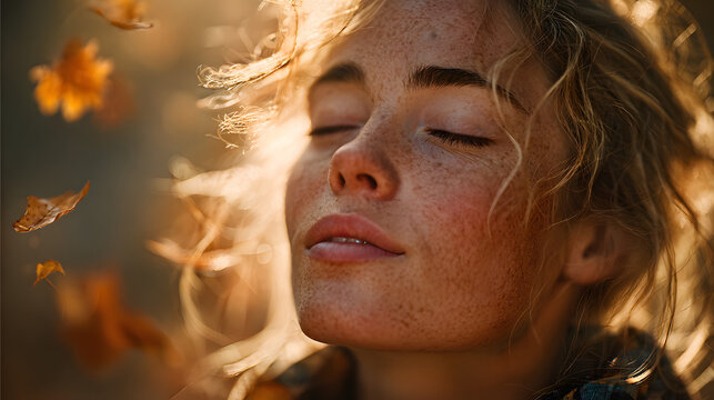A joyful woman with closed eyes, embracing the warm sunlight while surrounded by gently falling leaves, conveying a sense of happiness and harmony with nature.
