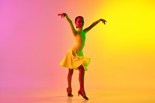 Emotional little girl in yellow stage dress dancing classical ballroom dance over gradient pink-yellow background in neon light filter.