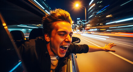 Young caucasian male joyfully leans out of a car window with windblown hair during a fast night drive through a city, surrounded by vibrant lights.