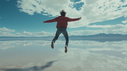 A joyful young woman with curly hair in a red striped crop top and jeans spins against a vast blue sky, capturing carefree summer energy and movement.
