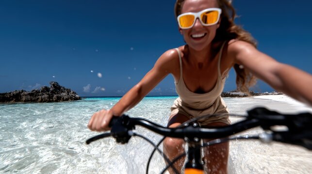 Father swinging daughter on beach at sunset with golden glow and wet-sand reflections