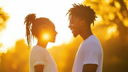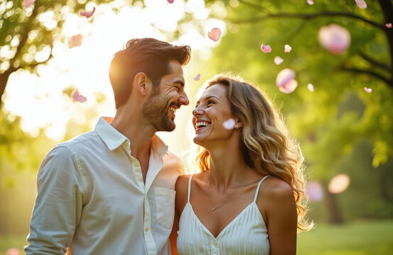 Young happy couple laughs together in sunlit park. Man, woman share romantic moment outdoors with soft falling flower petals. Enjoy beautiful spring summer day. Joyful expressions show true love,