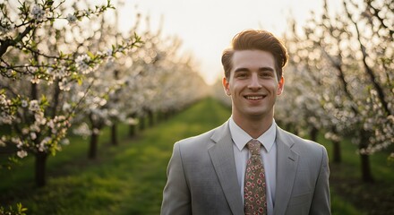 Smiling man in grey suit standing in blooming spring orchard. Cherry blossom engagement photo. Easter, Earth Day, wedding season concept. Romantic outdoor portrait.