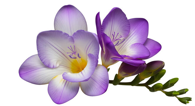 Two freesia flowers with purple and white petals    .ai generative, transparent background, white background. isolated on white background, png, jpeg, jpg.