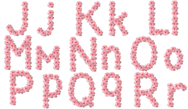 English alphabet from flowers of pink roses, letter J,K,L,M,N,O,P,Q,R.